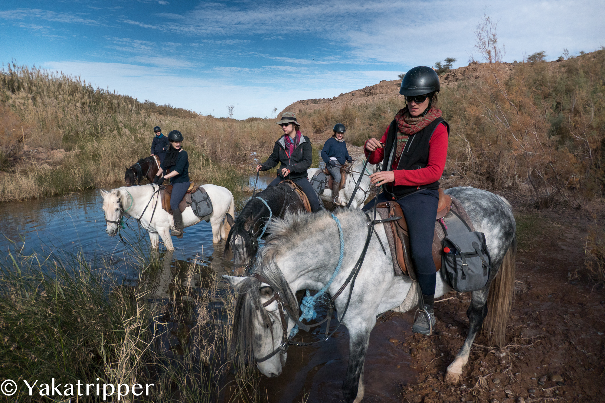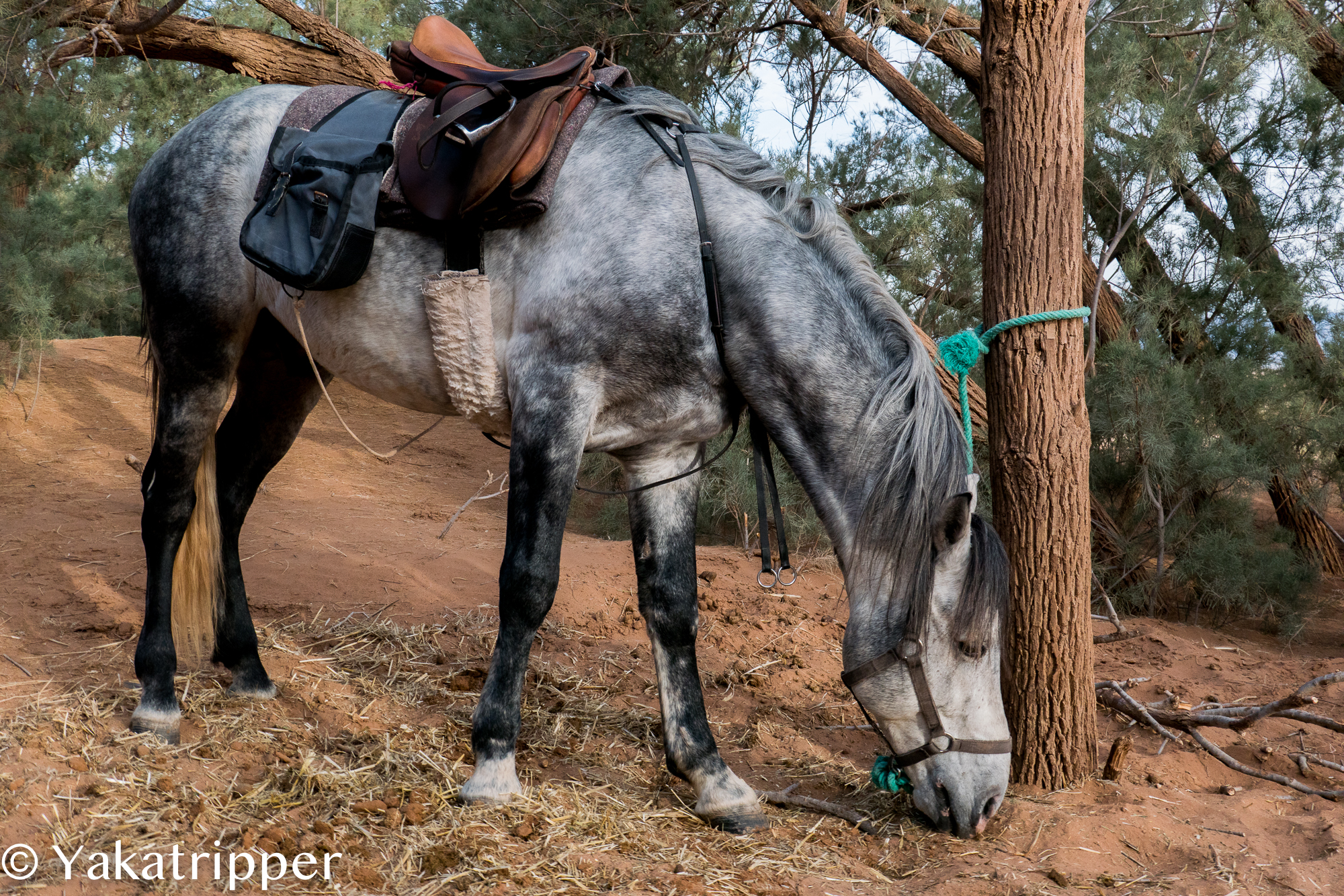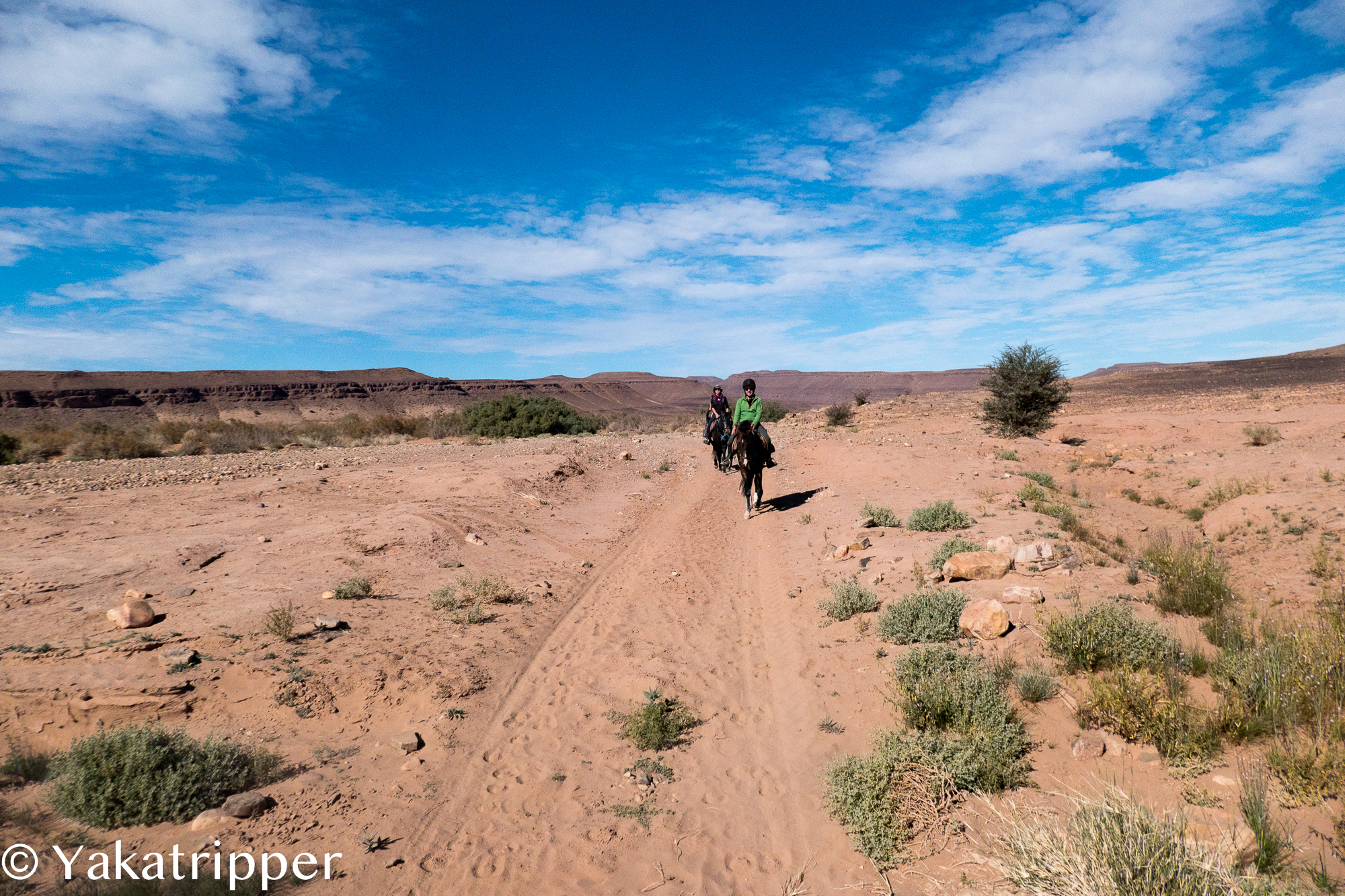 La nuit fut paisible et réparatrice. Les chevaux ont eu leur ration d’avoine matinale et c’est maintenant notre tour. Un copieux petit déjeuner nous est servi sous la grande tente. La toilette de ce matin se limite au brossage des dents puis c’est parti. Nous équipons nos montures et prenons la direction de Tagounite, vers le sud.