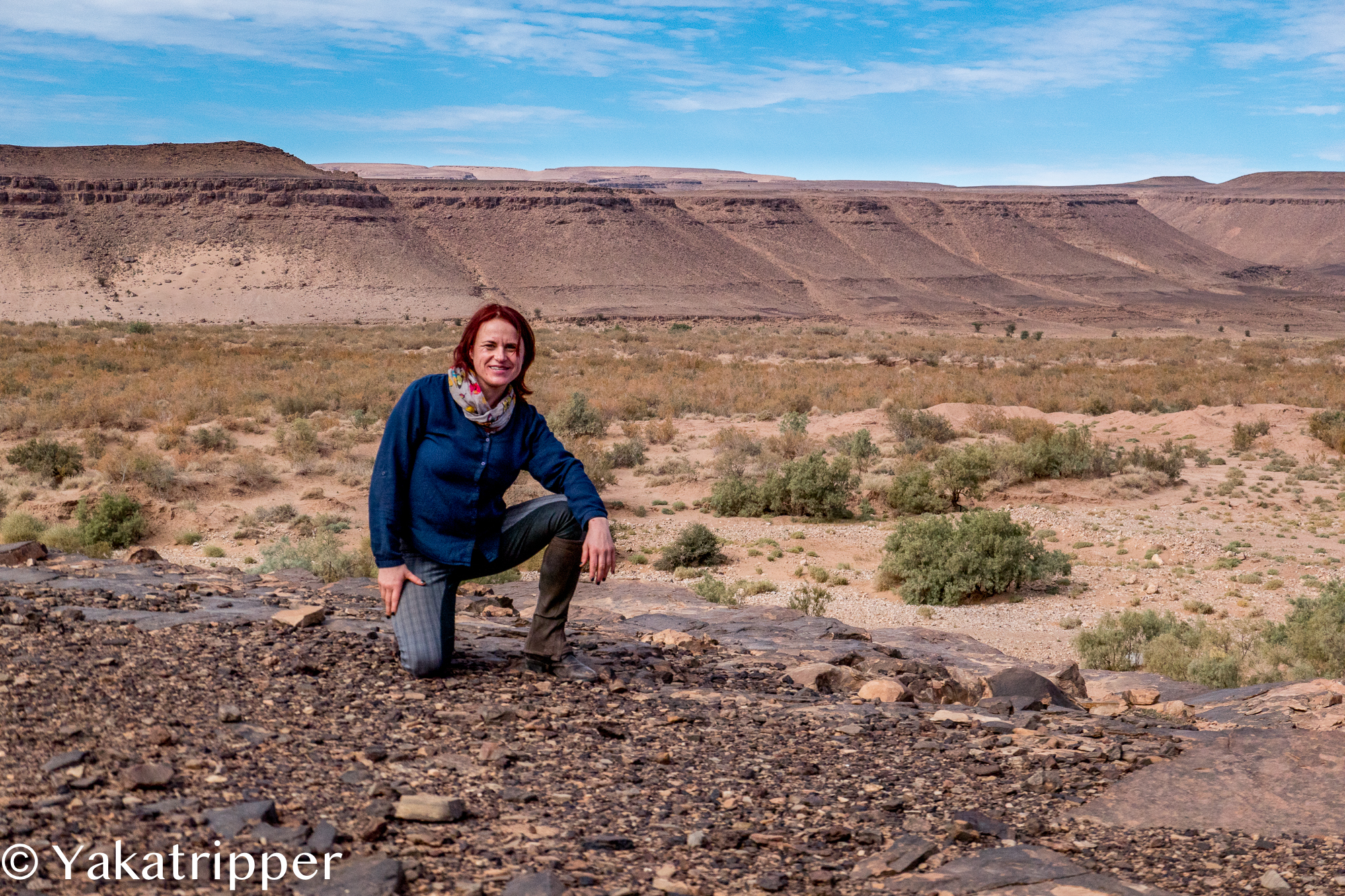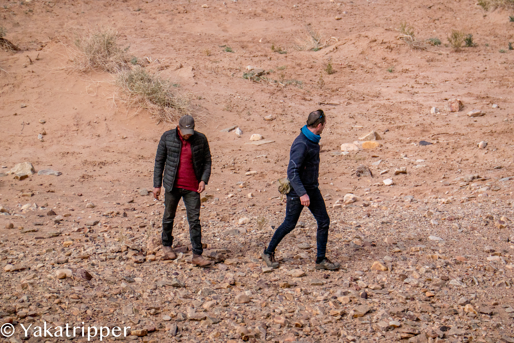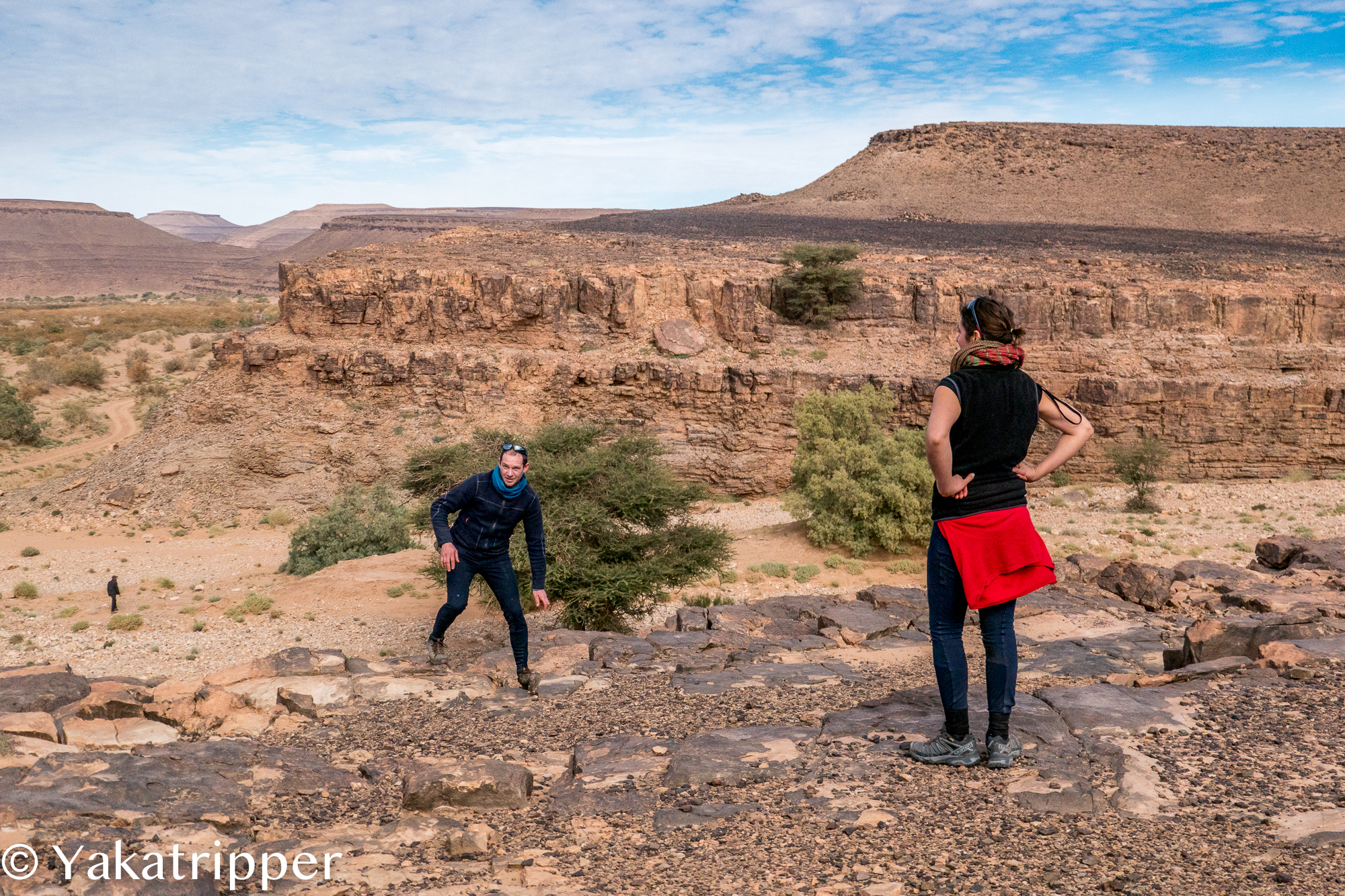 Il est maintenant temps de s’arrêter pour casser la croute. Mostafa nous a choisi un superbe endroit dans les cailloux. Non pas que notre table improvisée soit elle même hors norme, c’est le site alentour tout entier qui l’est.