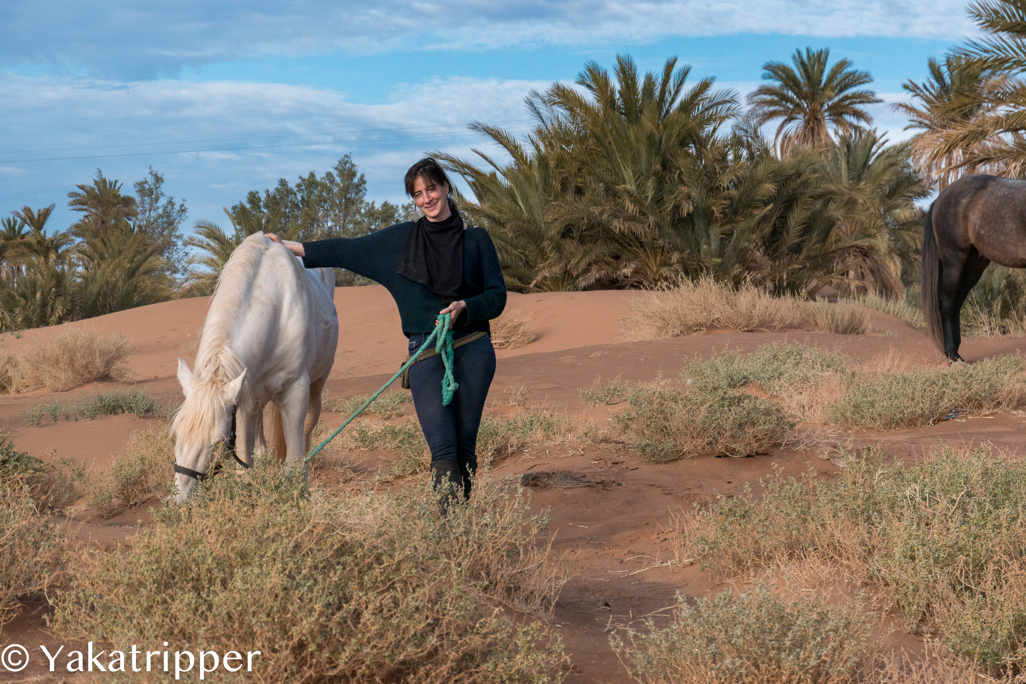 La fin d’après midi approche et nous ne tardons pas à arriver au camp. Ce soir, nous ne passons pas la nuit en bivouac mais dans un camping. Comme d’habitude, nous libérons les chevaux de la pression de la sangle et les marchons sur quelques centaines de mètres. Notre arrivée ne passe pas inaperçue et les jeunes qui jouaient au foot non loin de là viennent tous par petits groupes voir les chevaux se rouler dans le sable après que nous les ayons débarrassés de la selle et du filet.