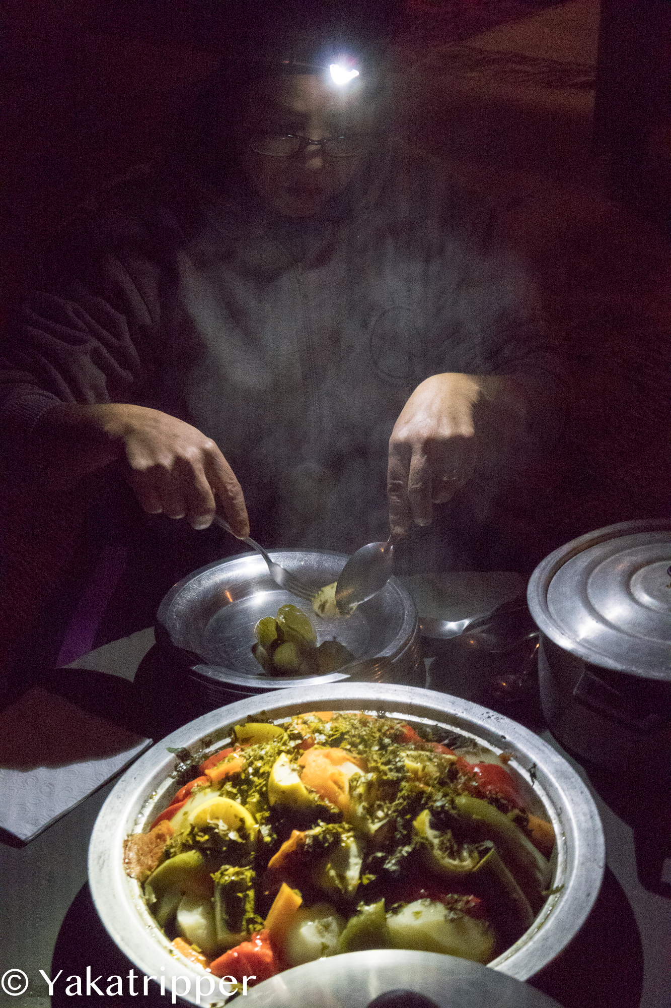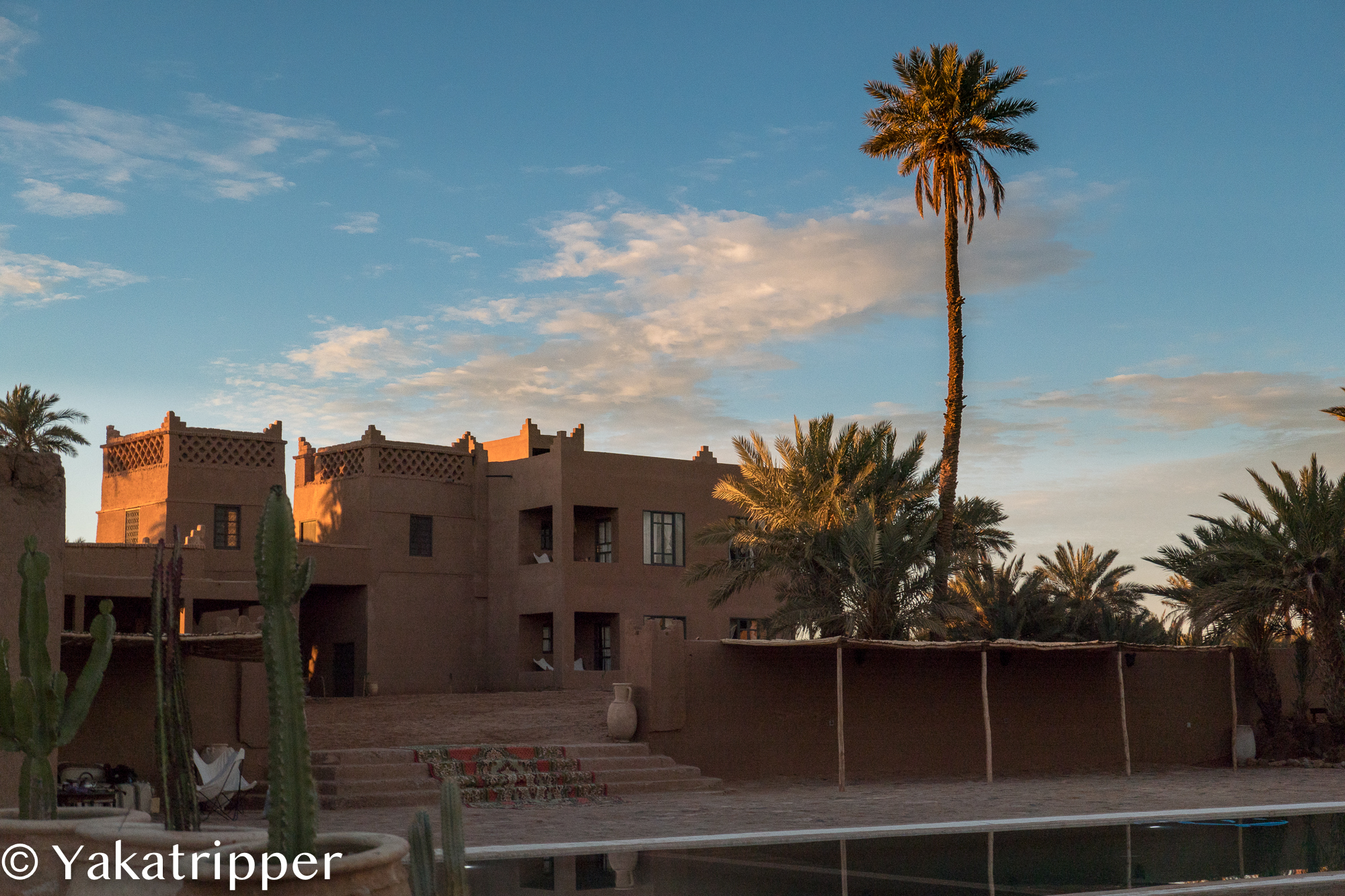 Nous sommes accueillis avec un thé marocain, des crêpes et de délicieuses confiture. L’eau de la piscine est fraiche mais la température de l’après midi ayant été quelque peu élevée (environ 34° au thermomètre de Fabrice), je me promet d’y plonger après la pause « thé ». Je prendrai finalement une douche et la fraicheur de la nuit me coupera l’envie de ce bain nocturne. Nous nous mettons à table autour d’un fabuleux tagine (une fois de plus) et enchainerons avec un beau moment autour du feu avec quelques locaux équipés de Djembés. Chacun de nous s’y essayera avec plus ou moins de succès. (vidéo à venir).