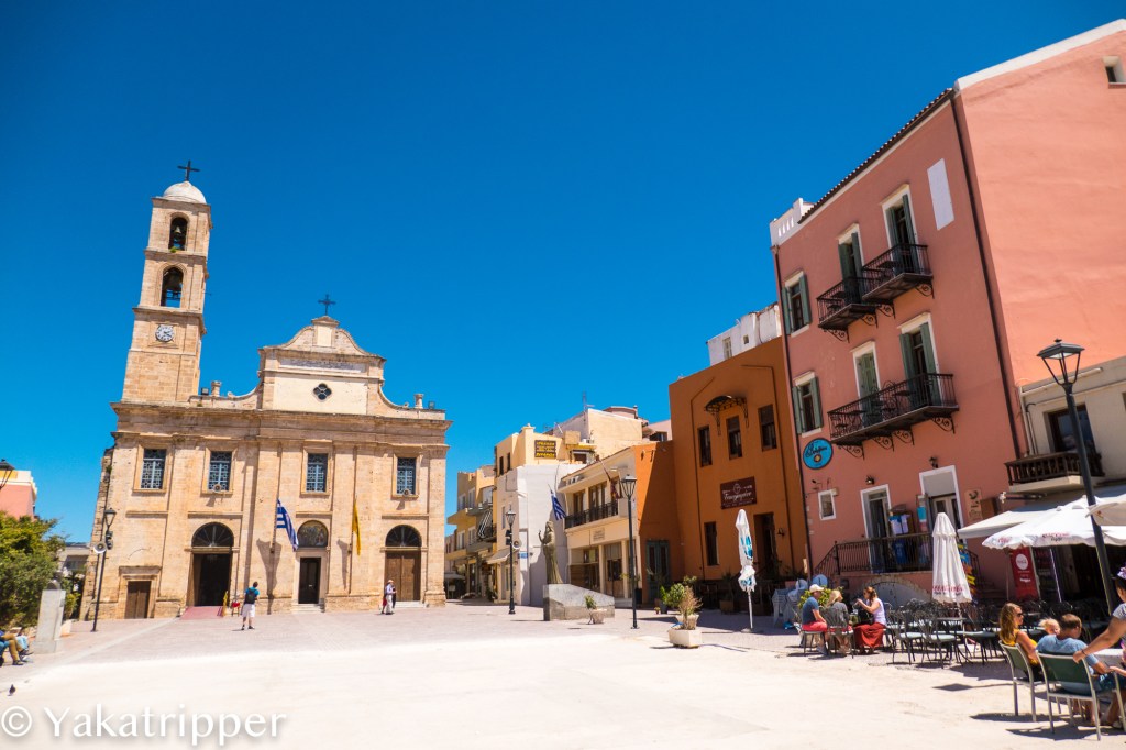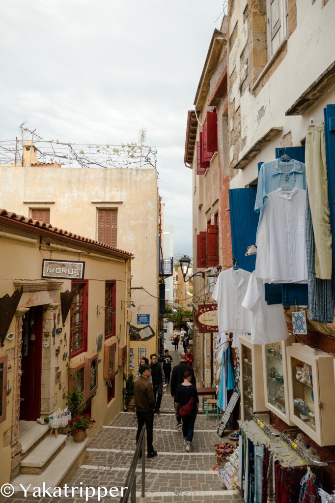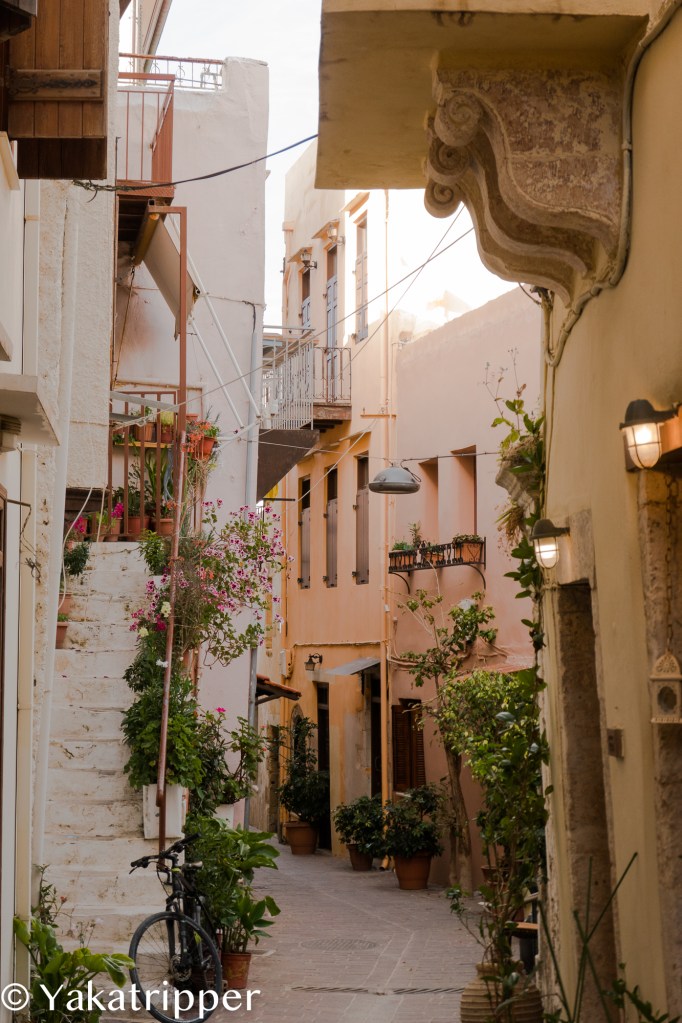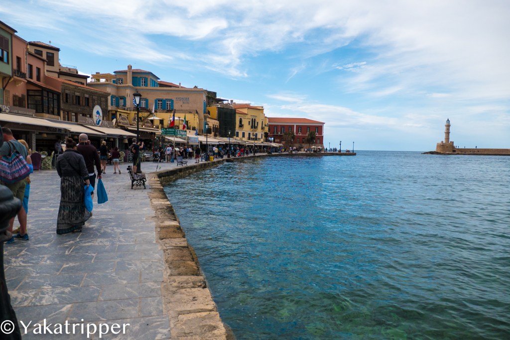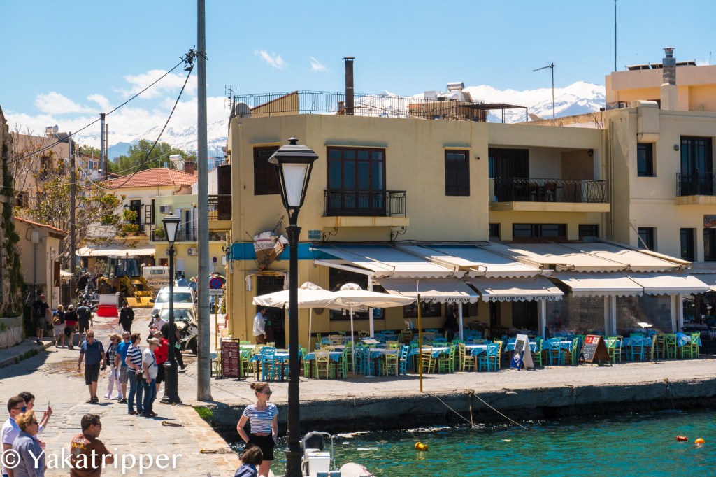 C’est après 3 heures 30 de vol que nous posons nos pieds sur le sol crétois. Nous sommes début mai et c’est ici le début du printemps. Ayant voyagé uniquement avec des bagages cabine, ce que nous privilégions de plus en plus, nous sortons directement de l’aéroport sans passer par la case « galère de récupération de bagages ». La température est douce, le ciel tout bleu et une petite brise bien agréable vient nous caresser le visage. Quelques coups d’oeil circulaires pour repérer notre loueur de voiture et nous voilà lancés sur la route. La conduite est un peu particulière mais je vais m’y faire. Nous faisons une pause resto sur la route avant de rejoindre notre ville d’attache, Chania. Chose très surprenante, nous pouvons observer plusieurs sommets enneigés depuis le bord de mer, et on a même pas pris nos après-skis.