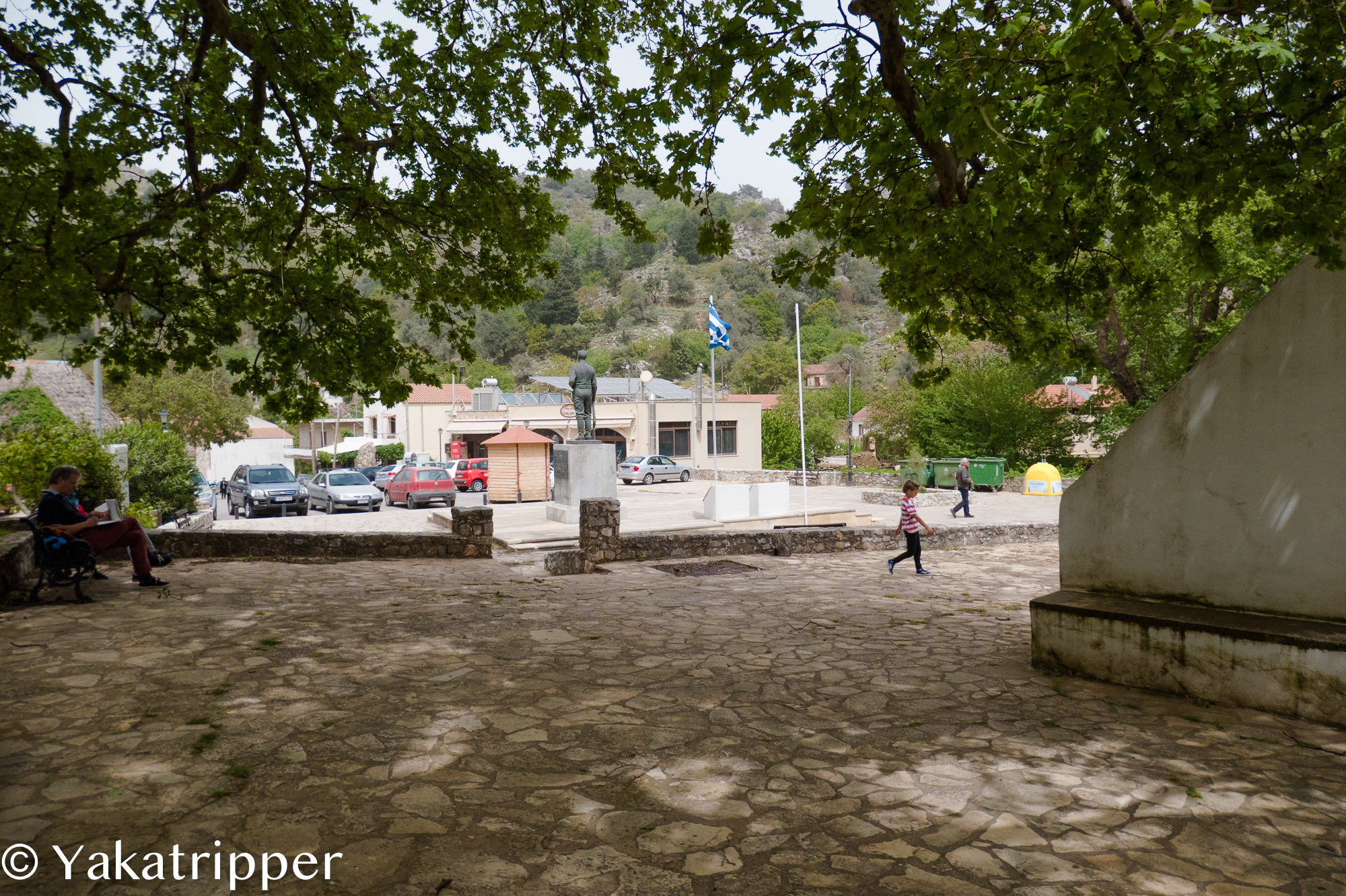 Nous profitons de cette halte pour déguster la délicieuse salade crétoise que nous avons préparé ce matin. Posés sur un banc de la place de l’église, nous nous abandonnons au plaisir de la nourriture.