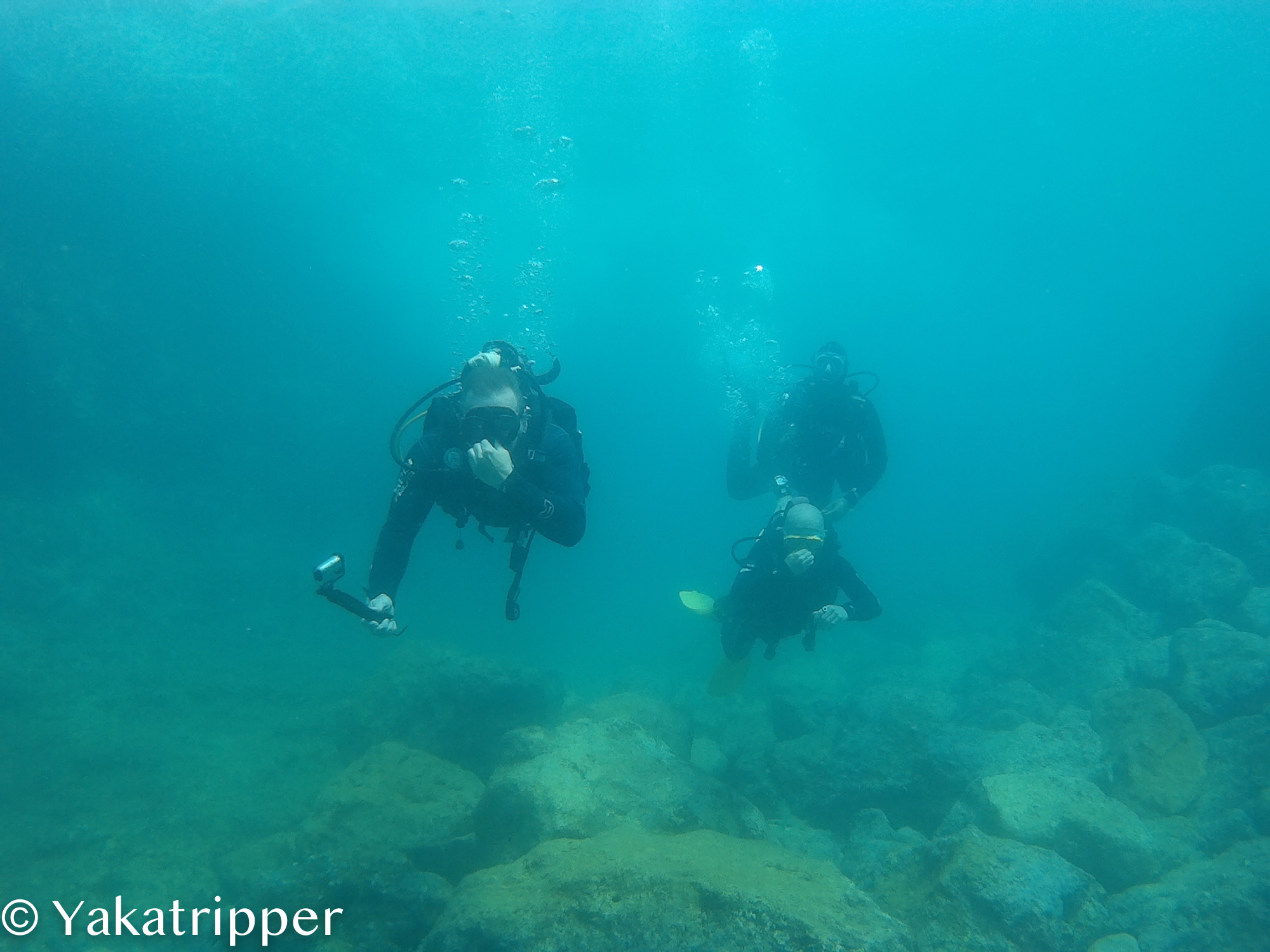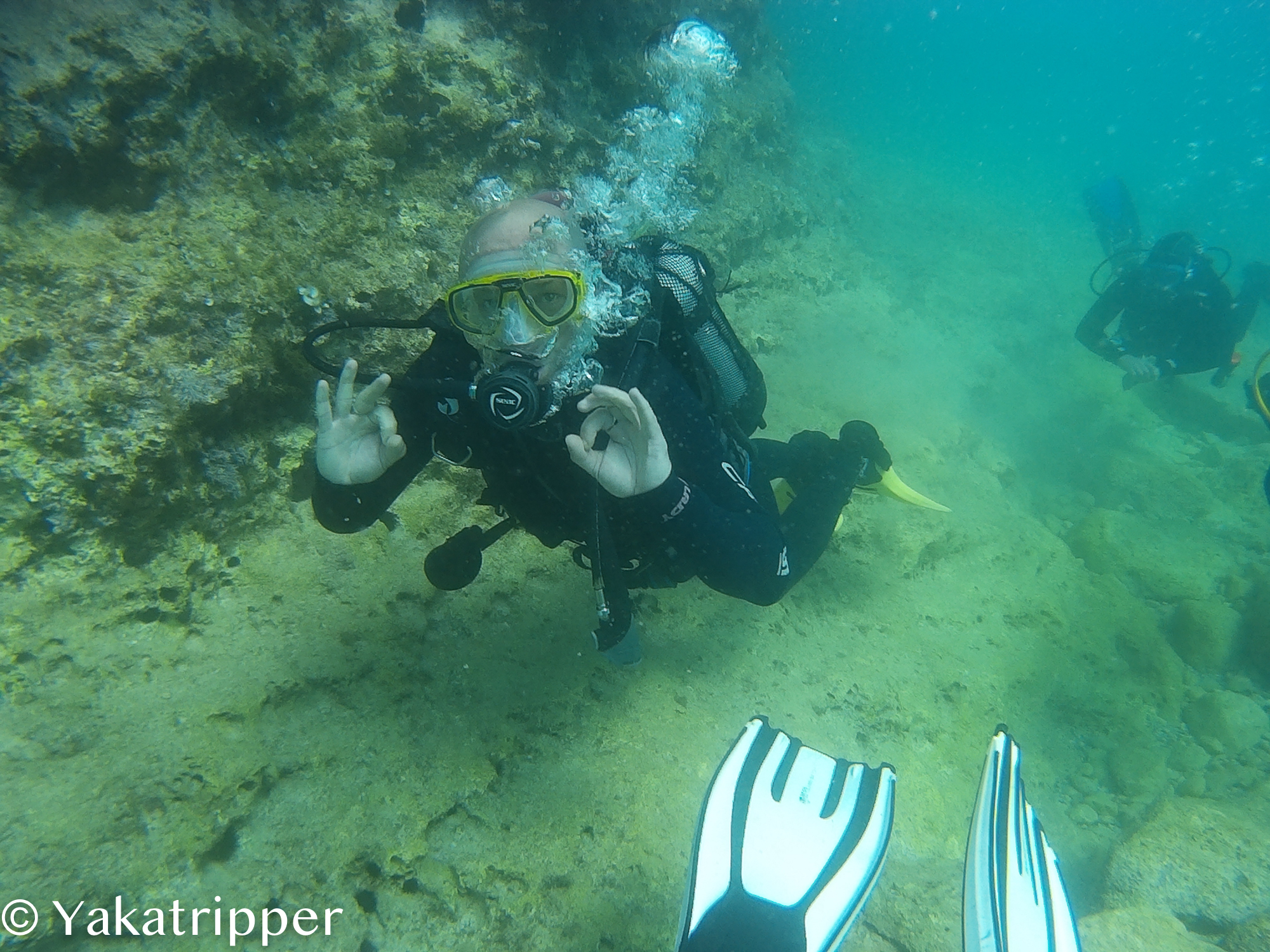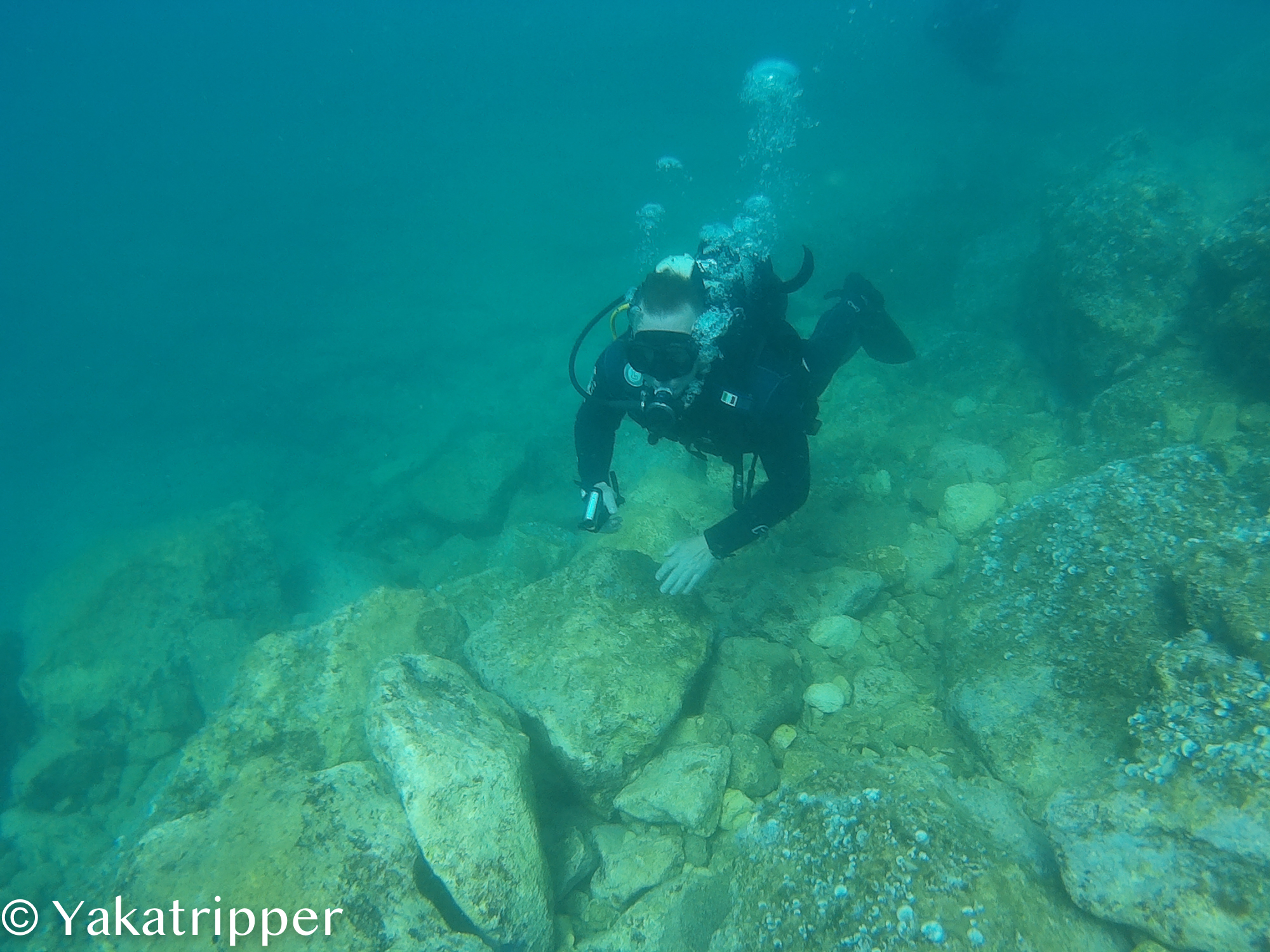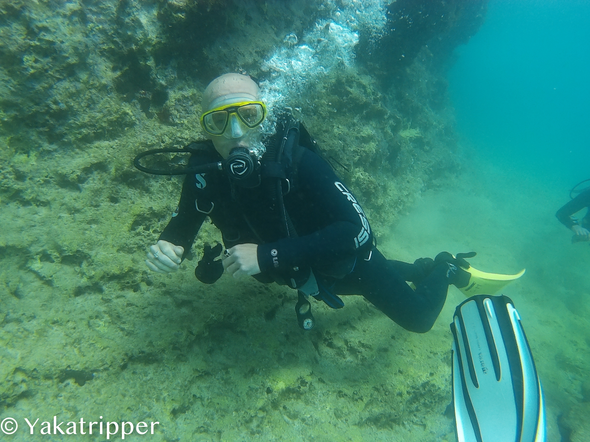 Il est déjà 14h passées et nous avons rendez vous à la demie à Almyrida. Nous avons réservés une sortie plongée dans un des clubs du coin. L’accueil est très sympa. C’est Justine, une française, qui sera l’une de nos deux instructeurs et qui va nous briefer. Fabrice a lui déjà passé sa certification avant de partir mais il participe tout de même à la séance qui se déroule au soleil devant l’établissement. Les démarches administratives effectuées, c’est Luis, notre deuxième instructeur, qui sélectionne pour nous le matériel nécessaire.
