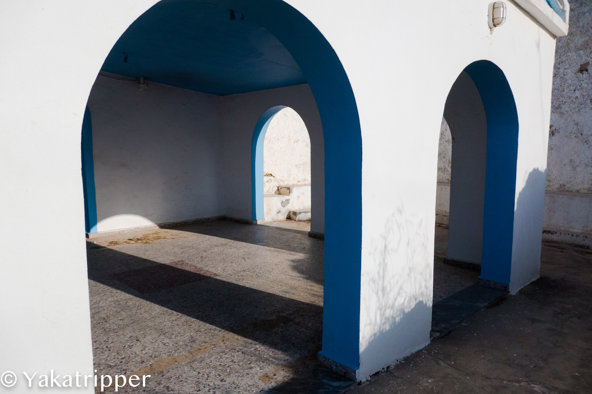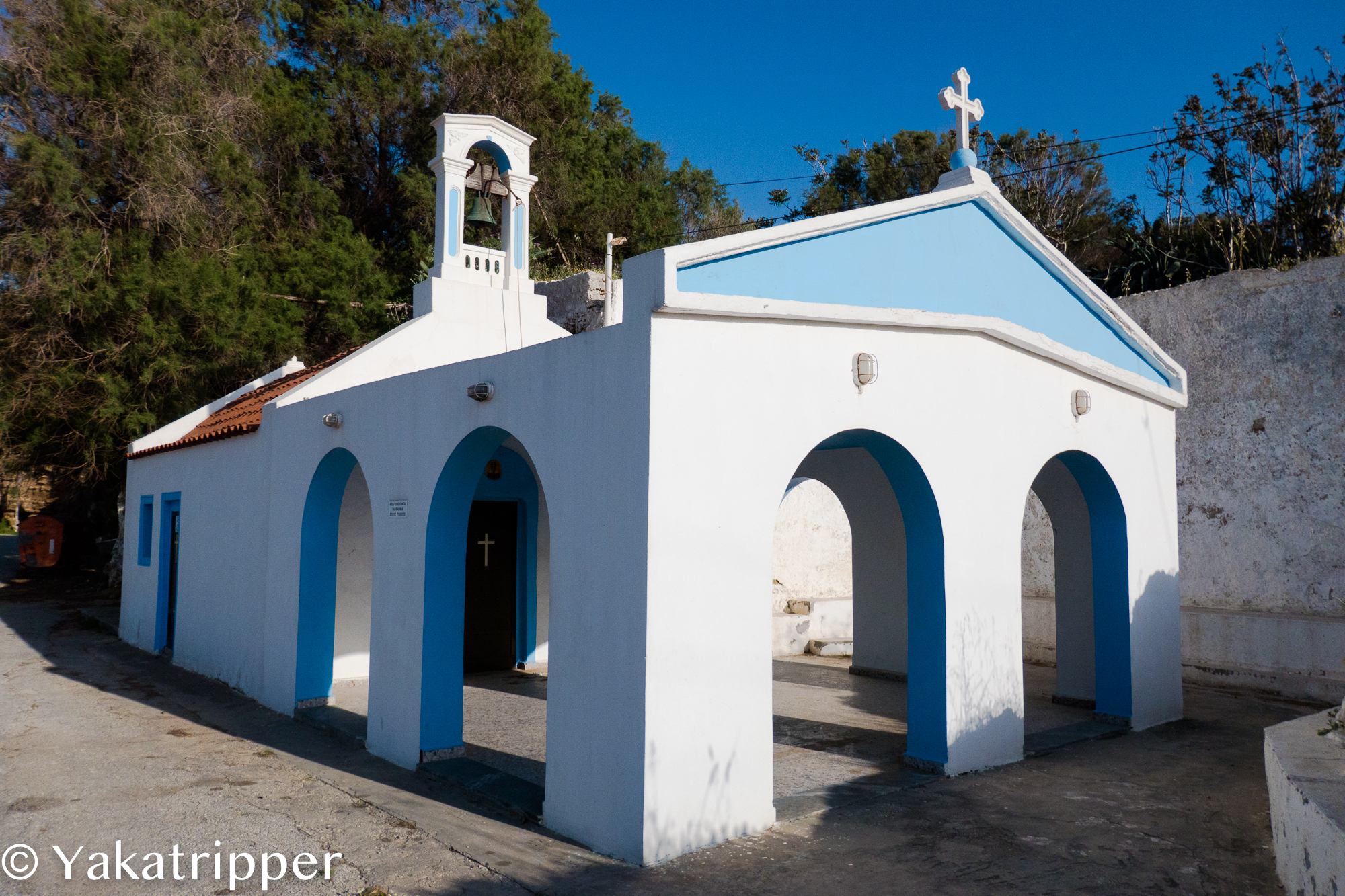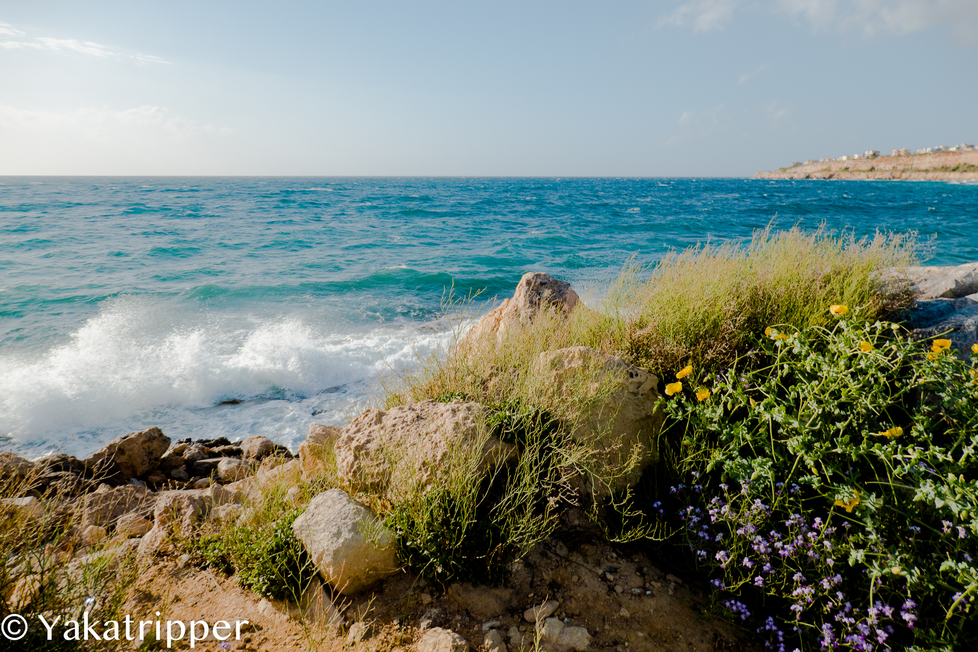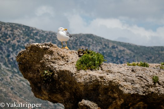 Le réveil se fait tout en douceur ce matin. Nous avons enfin pris le rythme des vacances. Le petit déjeuner traine un peu et il est déjà 11h quand nous quittons la maison. Le ciel est dégagé mais il souffle encore un vent infernal. Nous prenons la direction de l’est par l’autoroute. Je me sens obligé de faire quelques commentaires sur ce que les crétois appellent « autoroute ». La bande d’asphalte ainsi nommée est le plus souvent composée de 2 voies uniques sans séparation centrale. Et chose curieuse, la bande d’arrêt d’urgence, enfin ce qui y ressemble, sert de voie de rabattement lorsqu’un véhicule souhaite doubler, sans clignotants bien sur. Bref, pour résumer la conduite dans le pays, on franchit les lignes continues, on ne met que rarement son clignotant, et on roule tout doucement ou très vite. Ah oui, « l’autoroute » est limité à 80, voir 70 kmh. Bon, je clos le sujet et reprend la route. Enfin non, « l’autoroute ». Autoroute que nous ne tardons pas à quitter pour emprunter la petite route qui longe la côte. On y découvre de jolis petits villages et c’est à Kalives pour y manger un morceau. Une terrasse ensoleillée et à l’abris du vent n’attend plus que nous. Ce sera moussaka pour moi et saucisses grecs pour Fabrice.