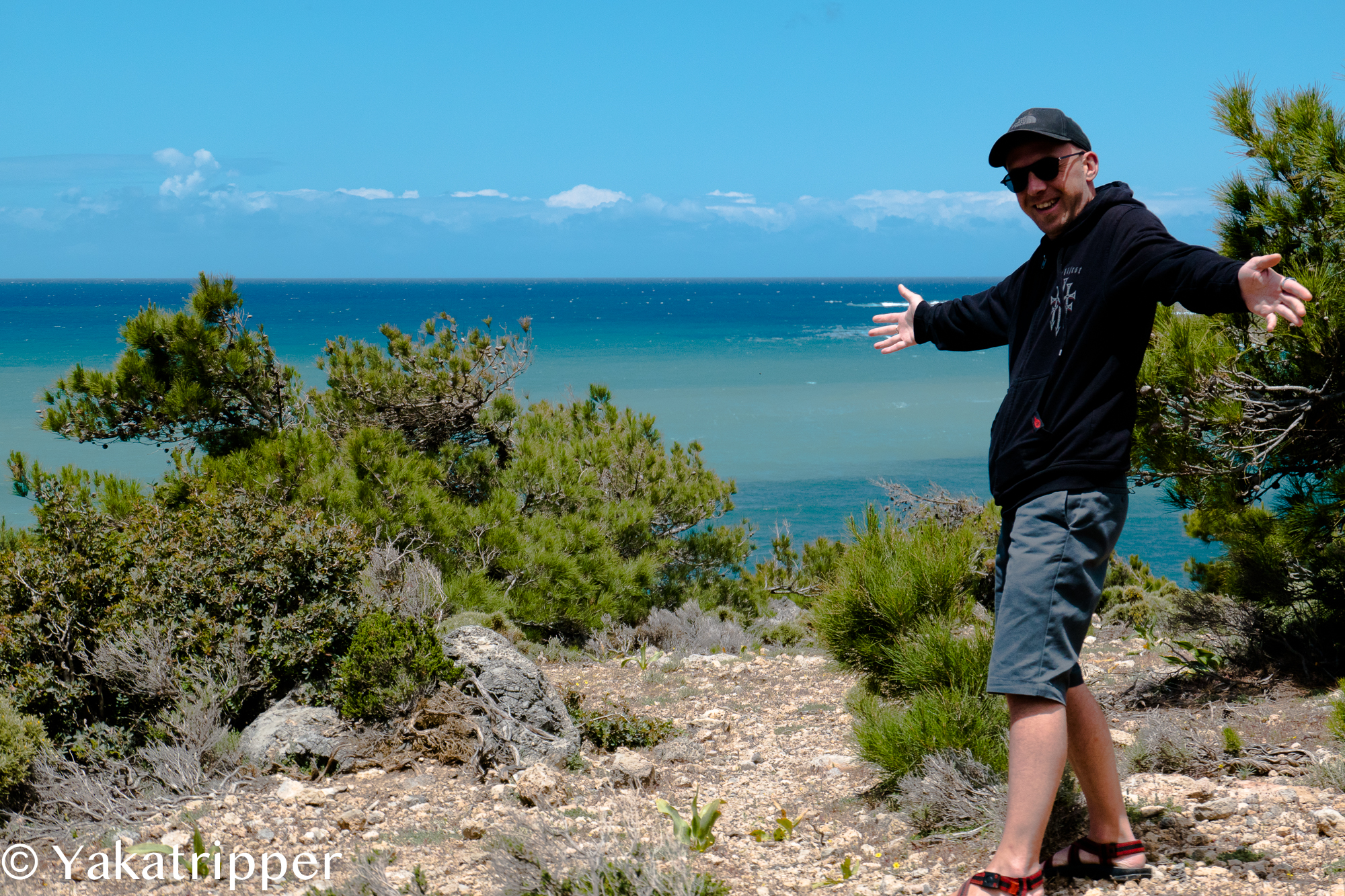 Les rayons du soleil viennent taper sur les stores et certains parviennent jusqu’à mes yeux encore mi-clos. Ce matin, c’est donc avec le soleil que nous démarrons la journée. Le plaisir ne sera que de courte durée. Le ciel s’encombre rapidement de vilains nuages et la clarté du matin disparait pour laisser place à une lumière d’automne, pas très réjouissante. Nous avions prévu d’aller à la plage dans le sud de l’ile et rien n’entravera nos plans. Nous préparons une grosse salade crétoise pour ce midi et nous voilà lancés sur les routes. Nous quittons « l’autoroute » après une vingtaine de kilomètres et profitons du premier village pour faire une halte « café ». A peine repartis, le temps dégénère et ce sont maintenant des trombes d’eau qui descendent du ciel. Que néni, on y va quand même. La pluie nous accompagne pendant une bonne partie du trajet jusqu’à laisser place à un joli ciel bleu. La route est sinueuse et par moment, la largeur de la voie nous interdit de passer à 2 véhicules.