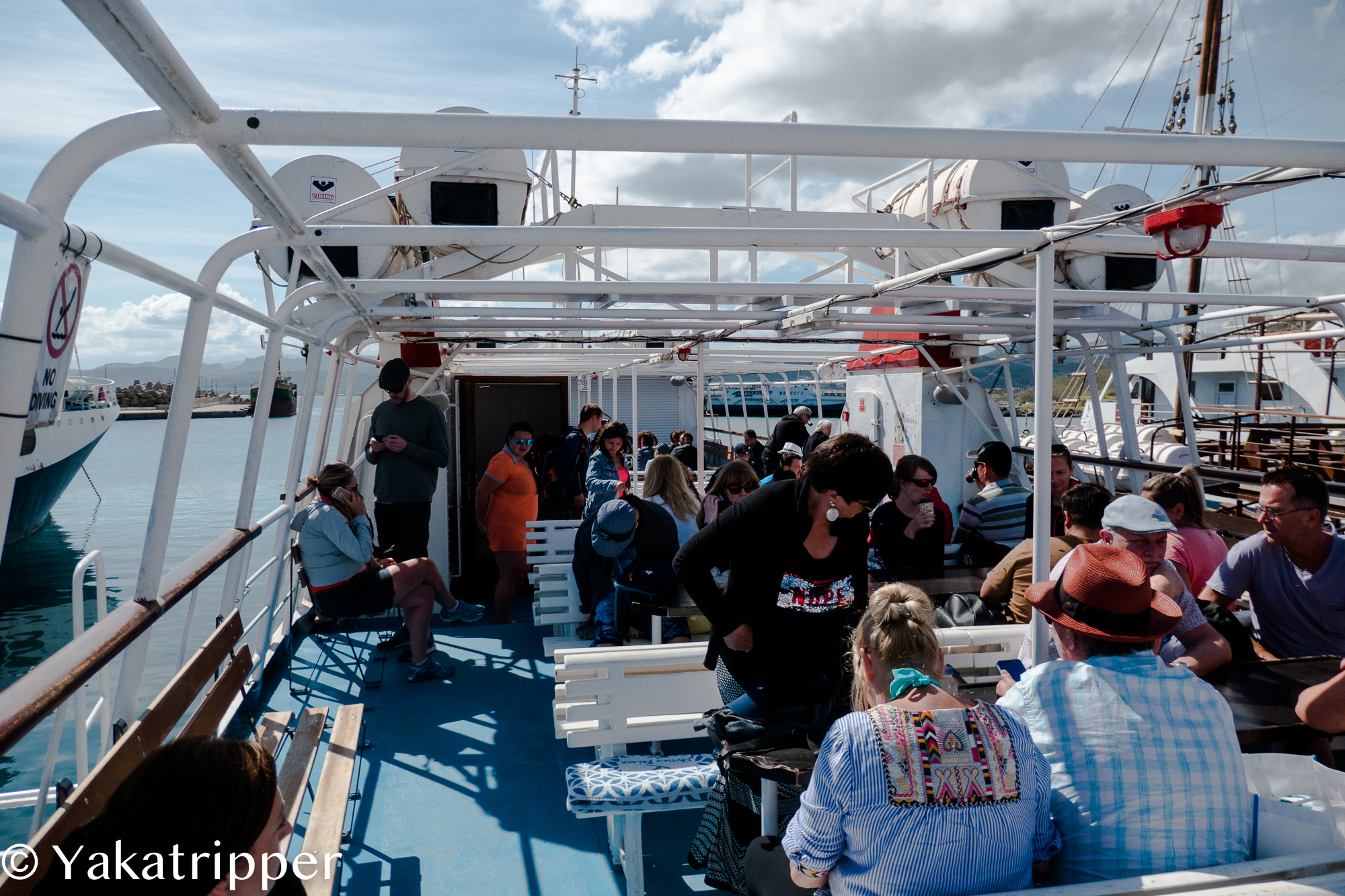 Le trajet en bateau est plutôt chouette. Nous longeons la côte pour passer de l’autre côté de la péninsule. Nous pouvons d’ailleurs apercevoir les voitures qui roulent au pas et s’arrêtent régulièrement sur la piste qui mène à notre destination. Celle-ci est essentiellement destinée au véhicules tout-terrains et c’est la principale raison qui nous a fait choisir cet autre moyen de transport qu’est le bateau.