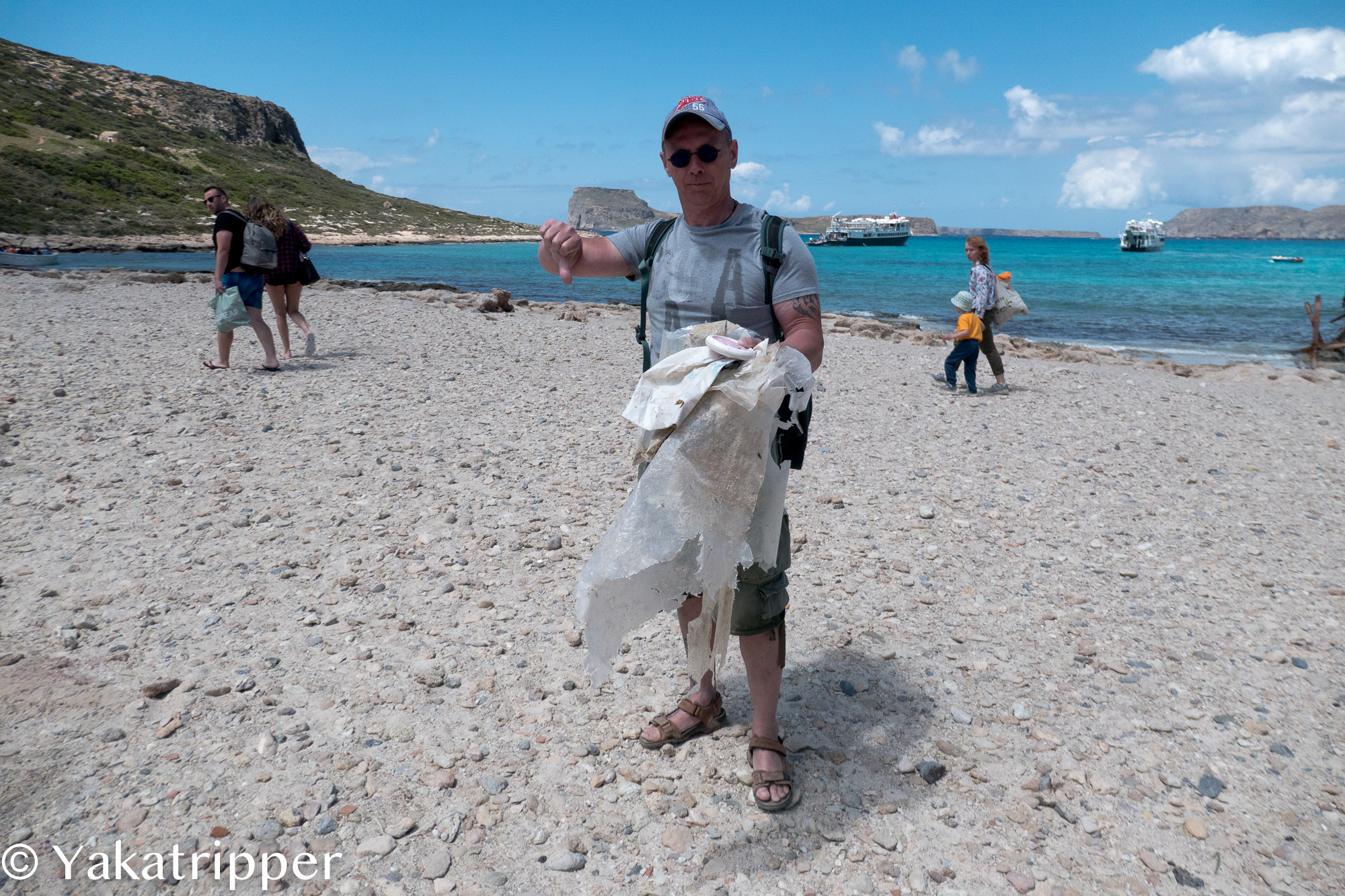 Sur le chemin du retour, nous collectons les sacs plastiques laissés sur place par les touristes ou bien amenés par la mer.