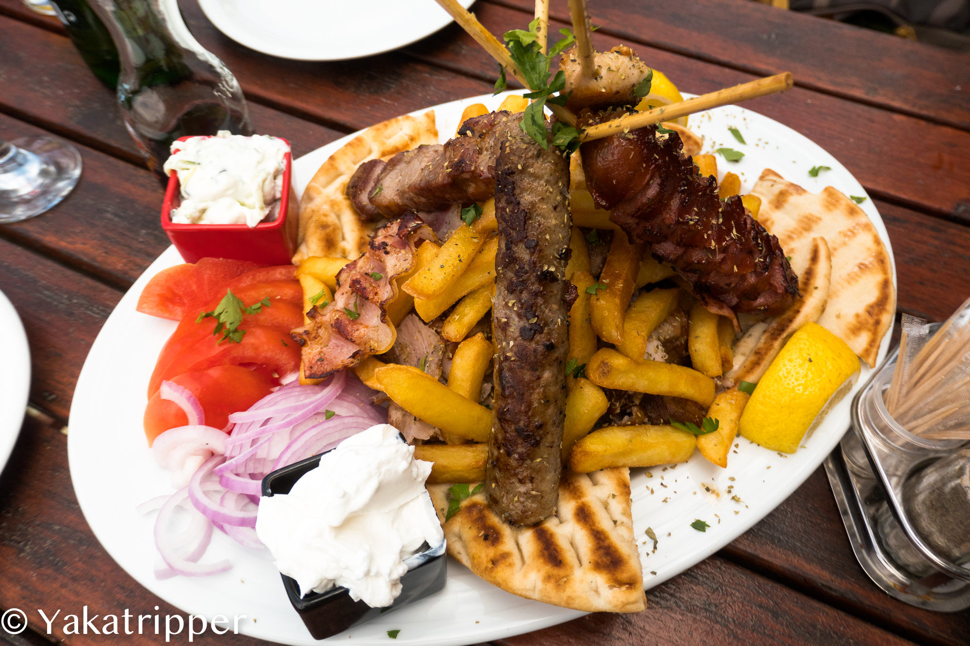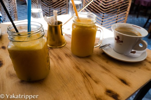 La faim commence à se faire sentir et nous faisons une pause dans un resto très sympa. C’est le seul dont la terrasse est déserte et on aime bien ce genre de choix, juste pour vérifier l’adage « le monde amène le monde ». Et ça marche, nous sommes à peine installés que 2 ou 3 autres tables sont dressées. La carte est simple et nous choisissons de manger local. Ce sera un mix grill pour 2.