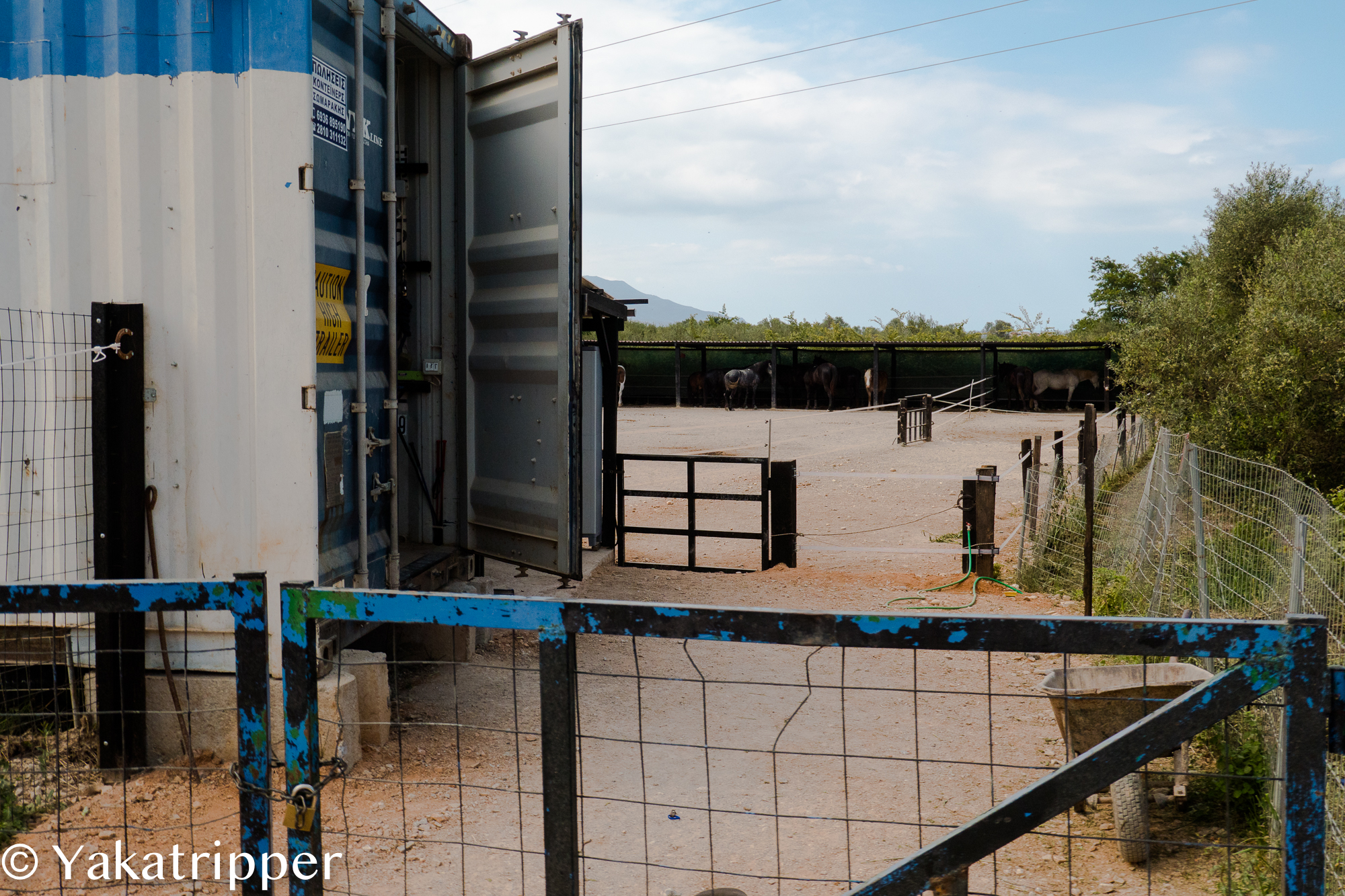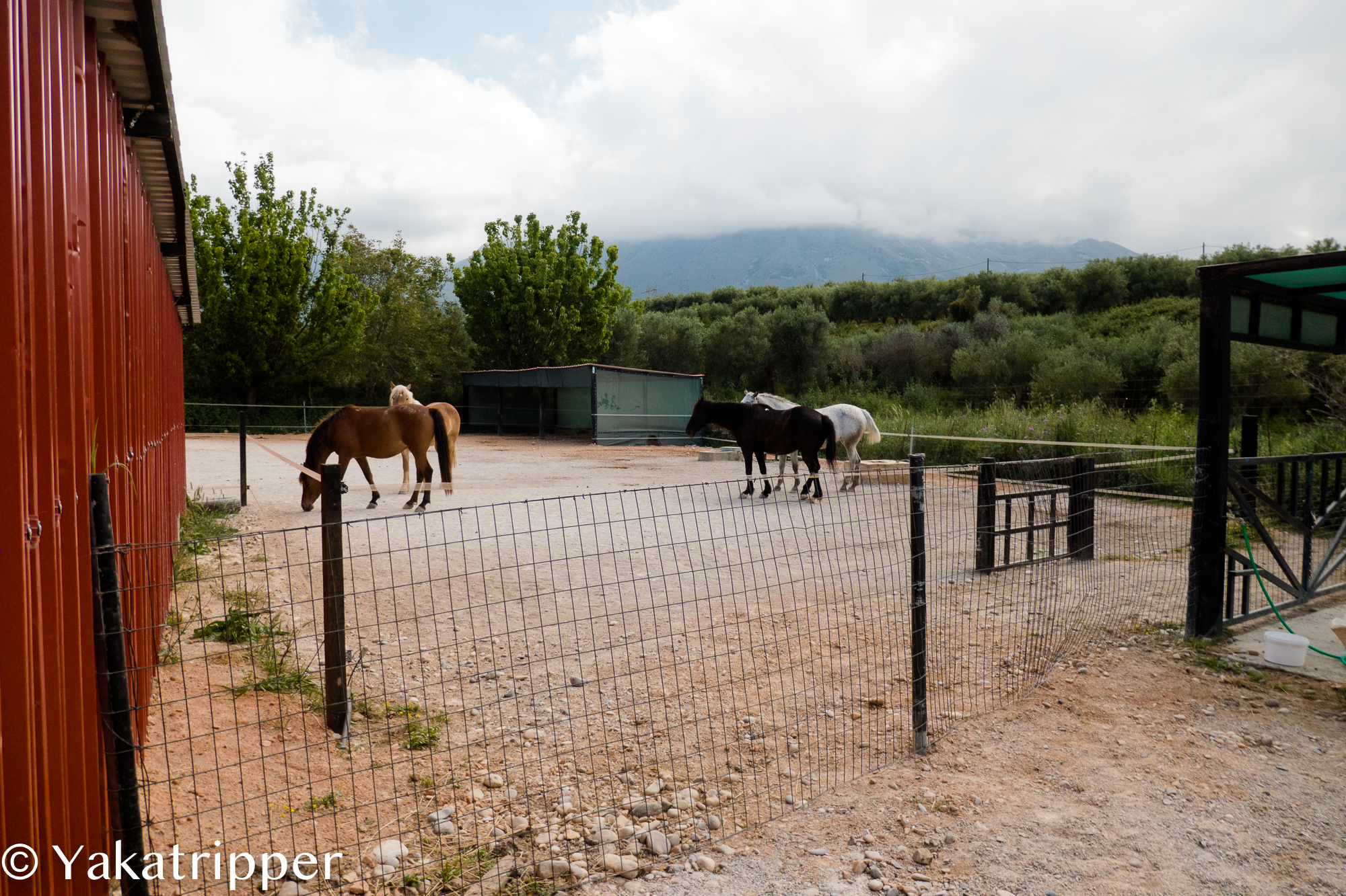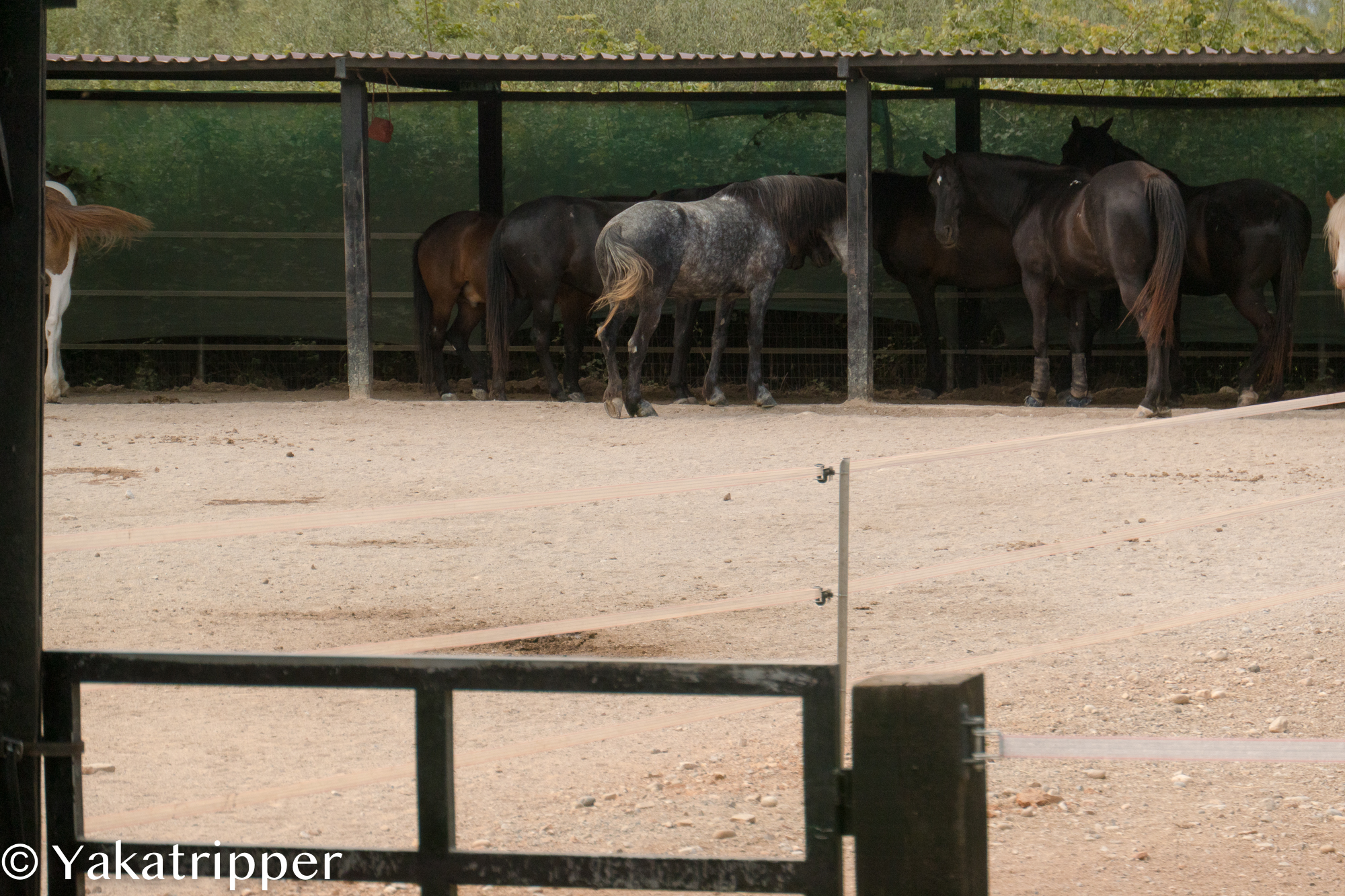 Arrivés sur les lieux, l’endroit est absolument désert. Hormis les chevaux et une espèce de chien de garde, il n’y a pas âme qui vive. Affiché sur la grille, un bout de papier griffonné nous signale que nous partirons avec un peu de retard. Rien de grave puisque nous sommes en vacances.