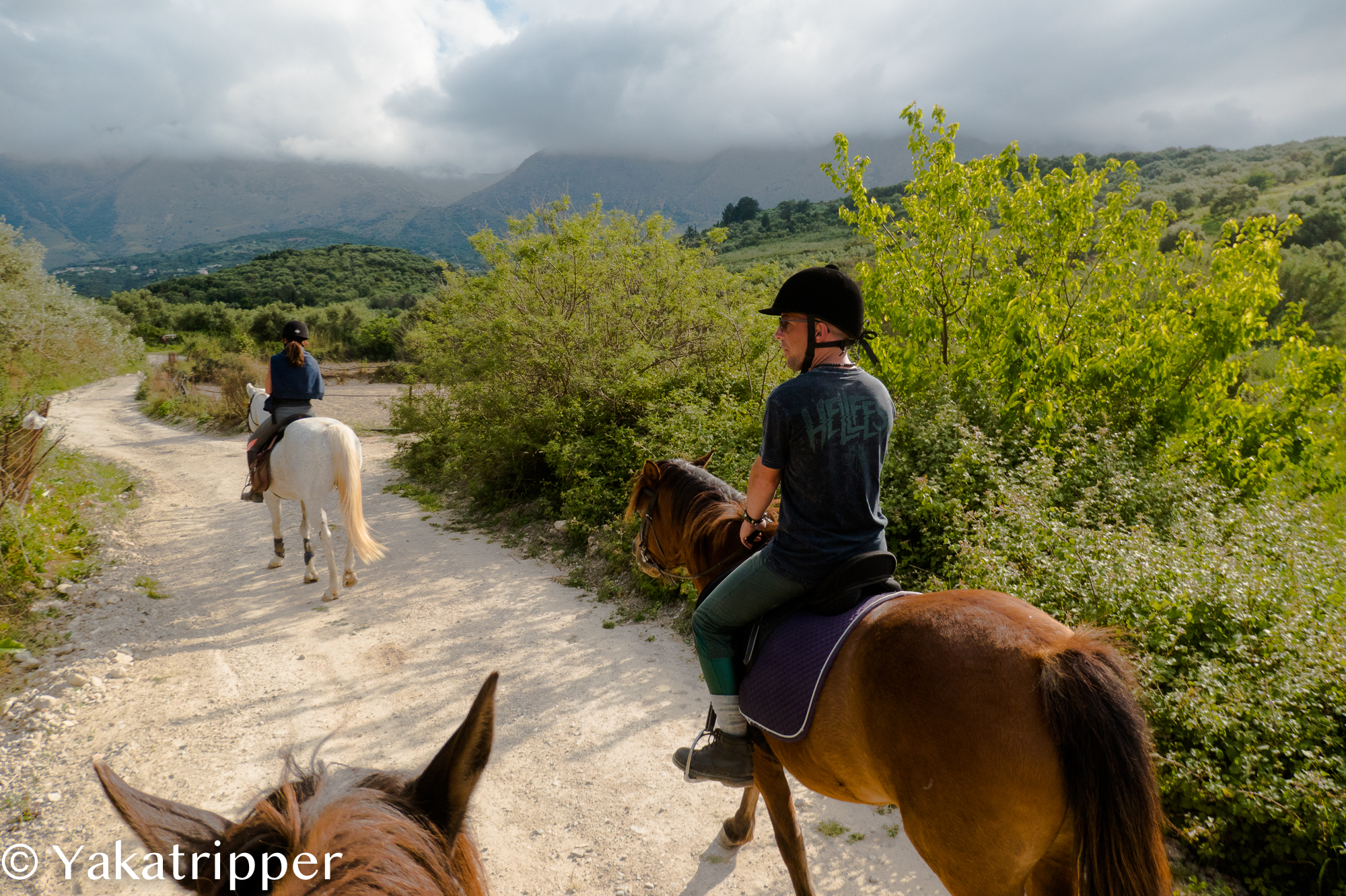 Christie, la propriétaire des lieux arrive également. Ce bout en train de petite dame est belge et nous accueille en français avec beaucoup d’humour et de bonne humeur. Nos chevaux sellés, nous partons en direction du lac Kourna. Nous ne sommes que 3, Laureen, Fabrice et moi, et après un peu de marche pour chauffer les chevaux, nous voilà partis au trot puis au galop entre les champs d’oliviers.